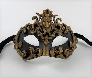 An ornately designed, handcrafted Venetian mask. This baroque colombina mask incorporates Venetian elegance and grandeur with traditional Venetian artistry. The mask is decorated in bold antique bronze designs.