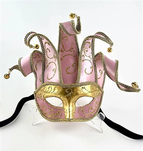 The mask displays a Jolly’s crown that is designed in pink fabric and decorated with gold glitter. Each point, on the crown, is outlined with golden ribbon and adorned with a golden bell and a faux pearl.