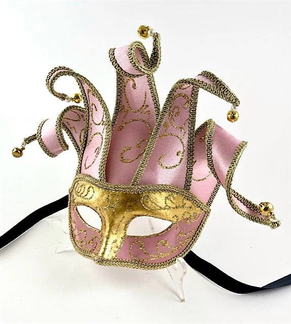 A beautifully hand crafted, Venetian ball mask. This mask is handmade in Venice, Italy from paper mache. It is beautifully hand painted in dusty rose pink and gold and decorated with gold glitter.