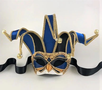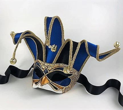 Hand painted in blue and black with accentuating gold designs this Venetian jolly mask is perfect for your next masquerade event.
